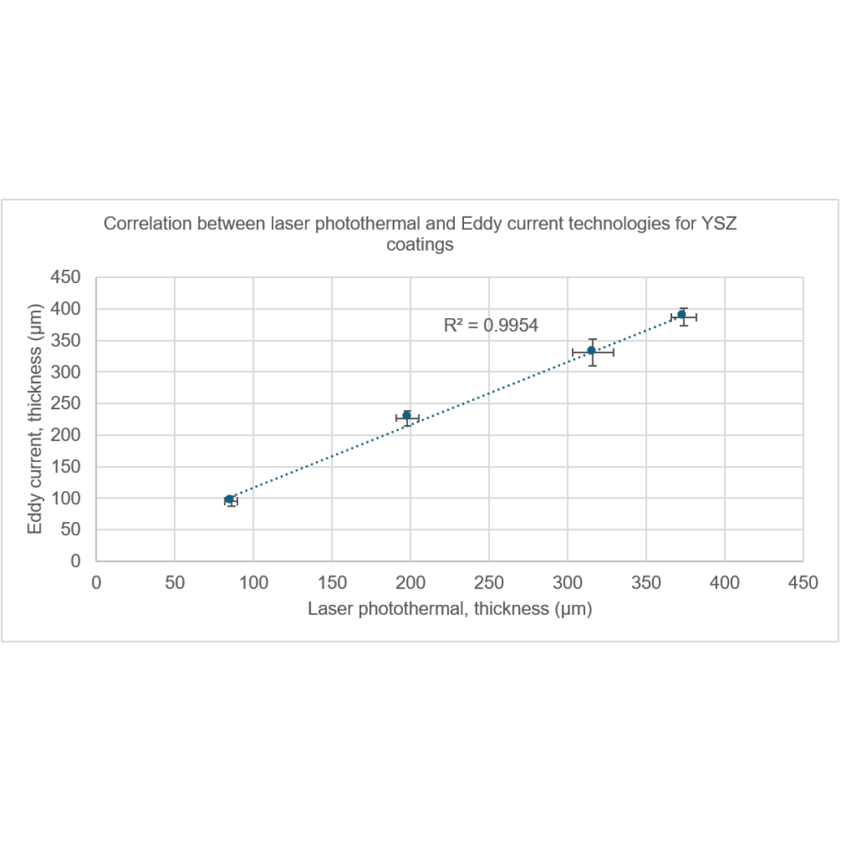 While a 99.5% correlation is observed between both techniques, it is observed that the Eddy current tend to overestimate slightly the YSZ thickness due to the peak effect described above. Additionally, the laser photothermal measurements report a lower standard deviation than the Eddy current measurements.