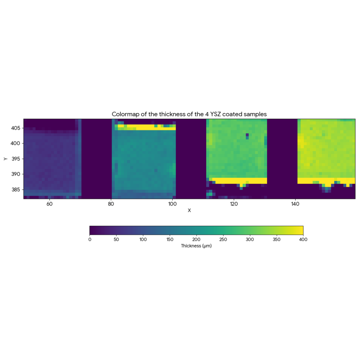 The feasibility study was performed on 4 flat coupons coated with YSZ (Yttria-Stabilized Zirconia) deposited through APS (Atmospheric Plasma Spray) with various thickness levels going from 47 µm to 374µm. Each sample had a dimension of 10mmx10mm so some small inhomogeneity of the deposition was expected within each sample.