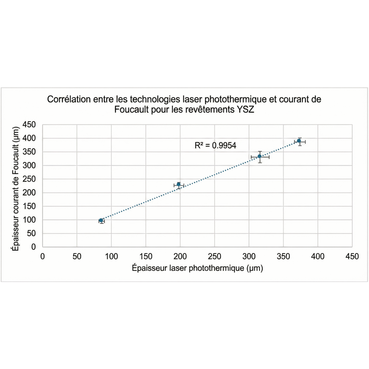 Bien qu'une corrélation de 99,5 % soit observée entre les deux techniques, on remarque que les courants de Foucault ont tendance à surestimer légèrement l'épaisseur de l'YSZ en raison de l'effet de pic décrit ci-dessus. De plus, les mesures par photothermie laser rapportent un écart-type plus faible que les mesures par courants de Foucault.
