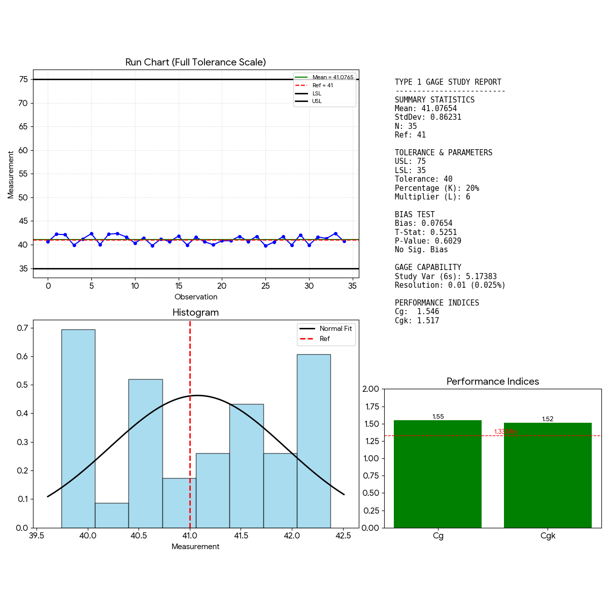 • Capabilité : Le Cg (1,55) et le Cgk (1,52) dépassent tous deux le seuil standard de 1,33. Cela indique que le système de mesure est capable. La variation est acceptable par rapport à la tolérance allouée.