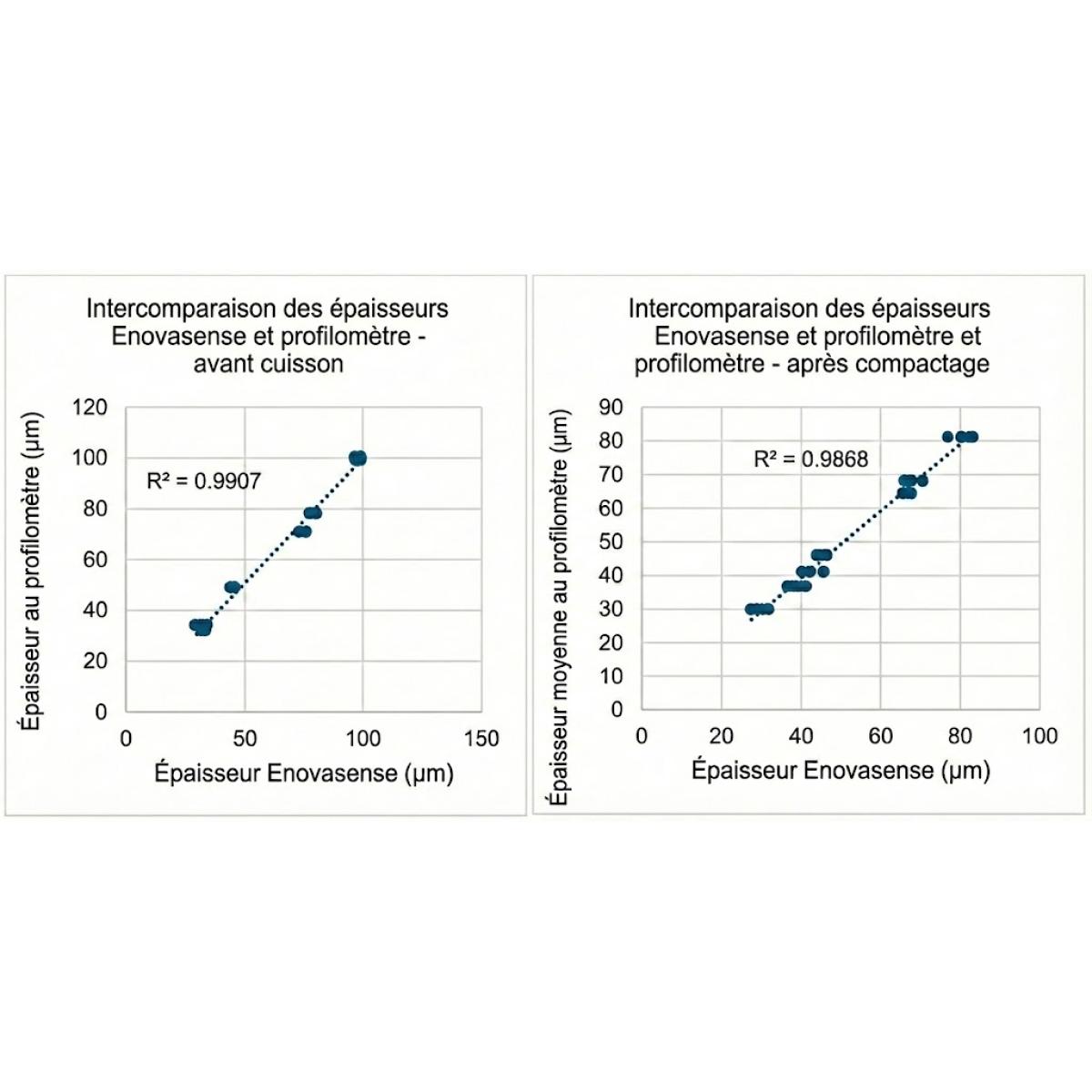 Nous observons que quelle que soit l'étape du processus où les échantillons sont mesurés – soit avant cuisson, soit après compactage – la mesure Enovasense est fortement corrélée aux valeurs du profilomètre.