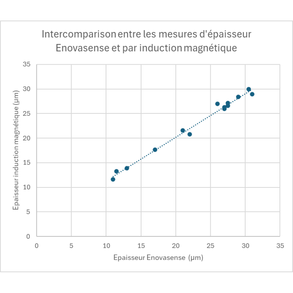 En ce qui concerne la précision de la mesure, Enovasense a effectué des tests sur des échantillons présentant différents niveaux d'épaisseur couvrant l'ensemble de l'intervalle de tolérance, entre 10 et 30 µm. Ces mesures ont ensuite été comparées à des mesures par induction magnétique.
