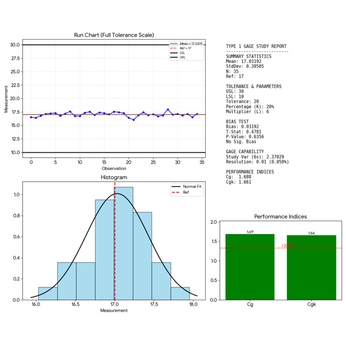 • Capabilité : Le Cg (1,69) et le Cgk (1,66) dépassent tous deux le seuil standard de 1,33. Cela indique que le système de mesure est capable. La variation est acceptablement faible par rapport à la tolérance allouée.